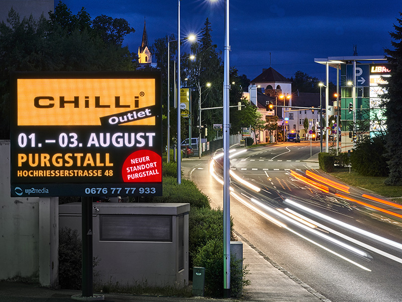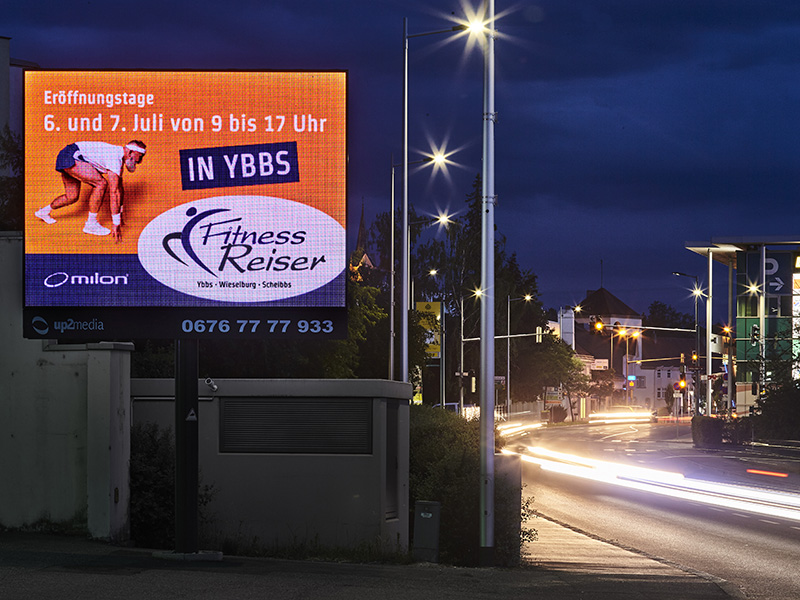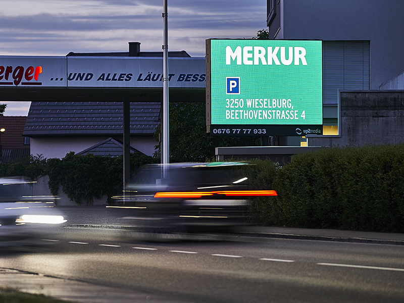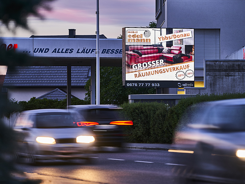Wieselburg Zentrum Beschreibung: Zentrum, B25a, im Ampelbereich Größe: 8,2 m2, BEIDSEITIG Sendezeit: 05:00-23:00 Uhr mind. Schaltungen/Tag: 320 Auflösung: 800 x 640 Pixel Preis/Woche: 200,--